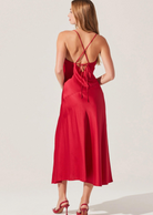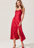 Beautiful cowl neck deep red dress with low back. Features adjustable straps with a tie closure and a thigh slit.