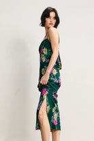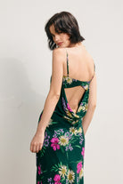 Foral print midi dress featuring an open back, cutout lower back, and a hook closure.
