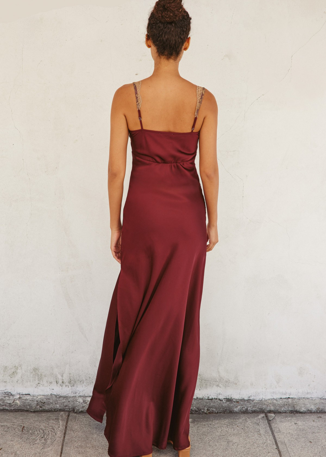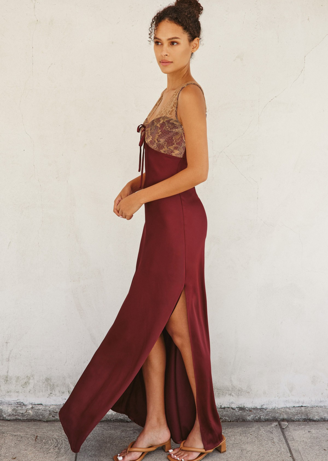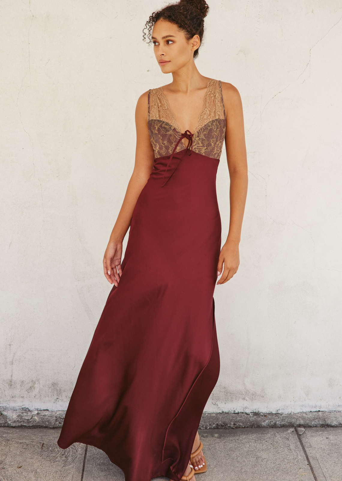 Beige Lace and burgundy satin contrast lingerie-inspired maxi dress. - Pull on design - Plunging neckline - Tie closure with a keyhole on the front neckline