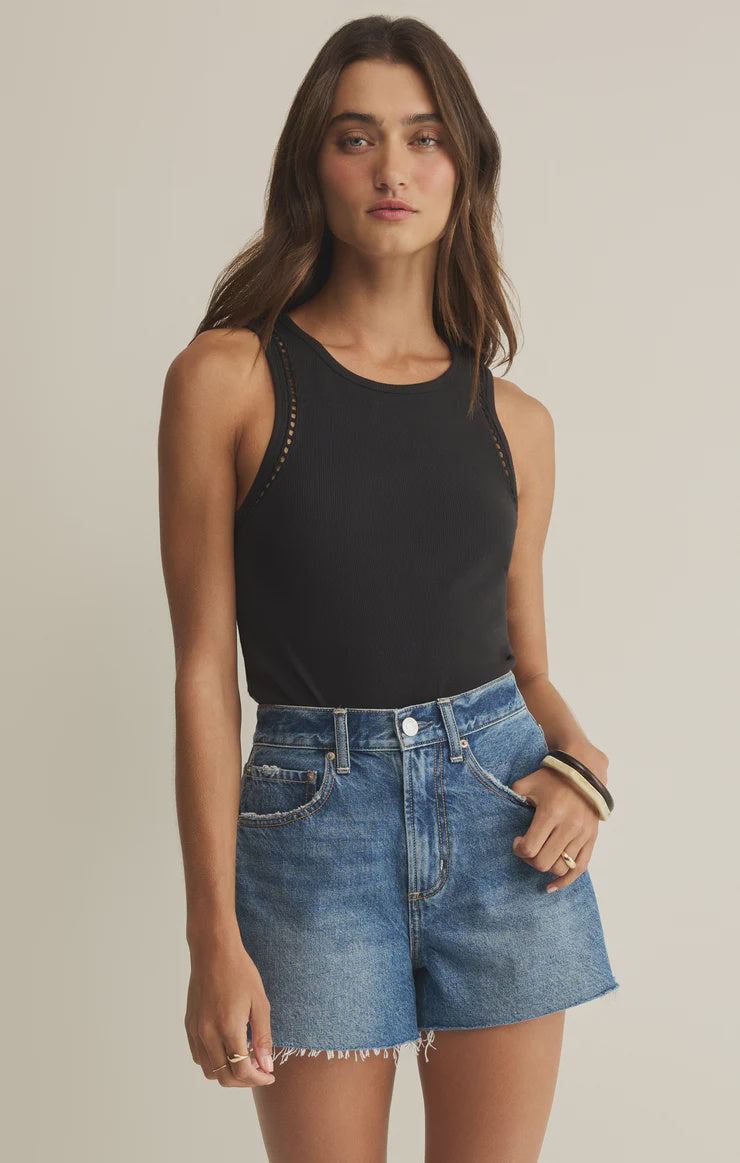 A lightweight, fine-rib cotton tank top with a classic crew neckline and delicate eyelet detailing along the edges. Easy, breathable, and feminine, this cotton top is an everyday staple made for warm days.