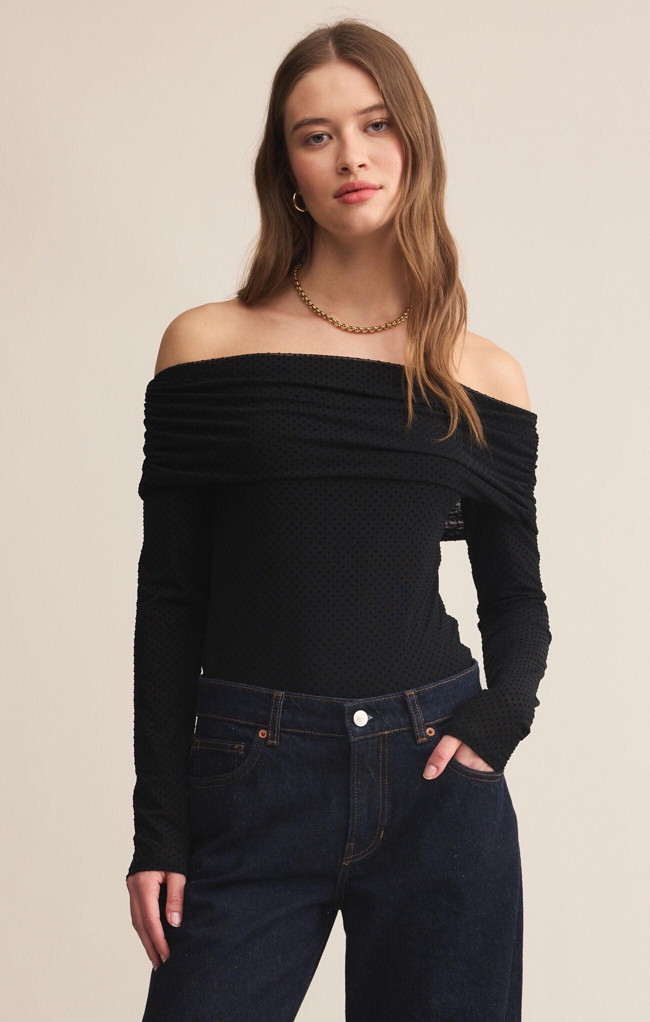 Elevate your night-out wardrobe with this chic off-the-shoulder top by Z Supply. Finished in dotted mesh fabric, the Whimsy top features a fitted silhouette with long sleeves and a foldover off-shoulder neckline.