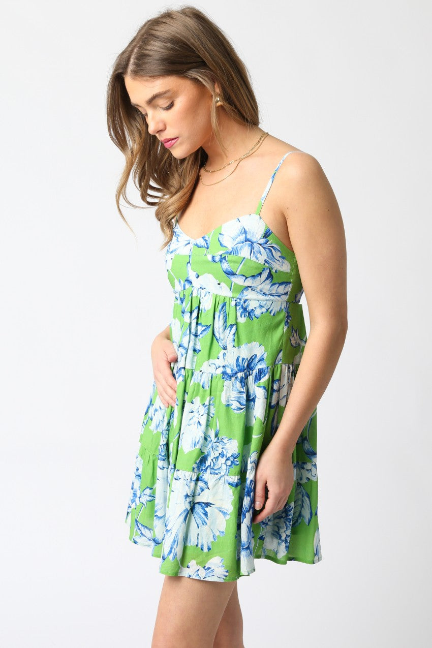Green and Blue Floral Dress screams Summer and features a cut-out back with corset closure and adjustable straps.