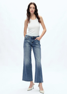 Mid-rise, loose straight-leg trousers in a medium blue wash, featuring regular whiskering and unique whiskers on the front, as well as on the back legs. The overall design is clean and elegant, making these trousers versatile and perfect for various occasions.