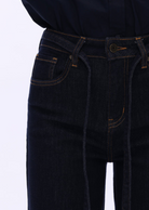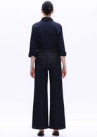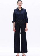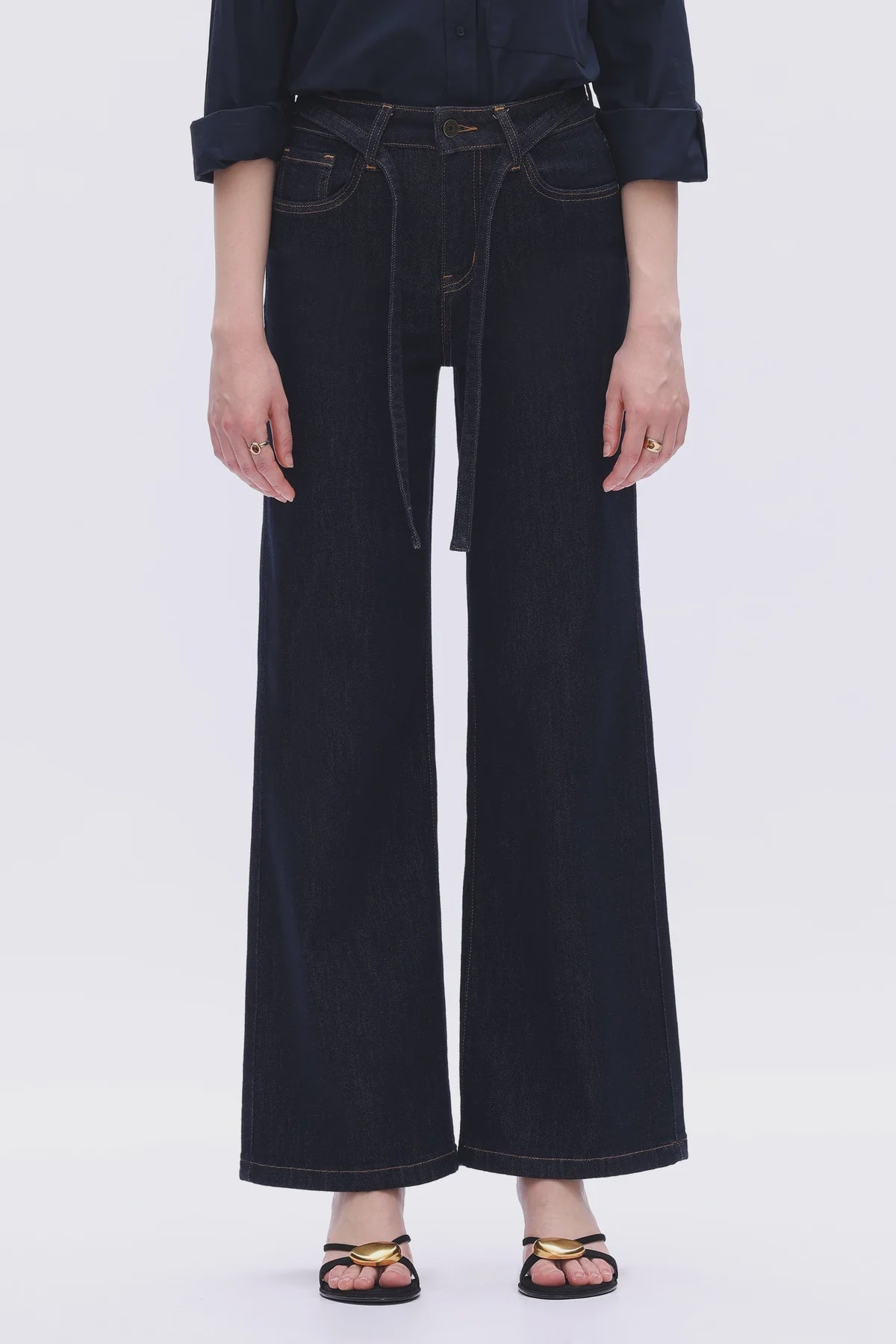 High-rise wide-leg jeans in deep blue with tie waist and clean silhouette. Flattering fit for casual chic looks, perfect with shirts or boots.