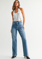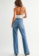 Featuring a flattering mid-rise and modern waistband detail, these jeans offer a fresh take on a classic silhouette. The wide-leg design elongates the frame and extends to a full-length hem, ideal for dressing up or down.