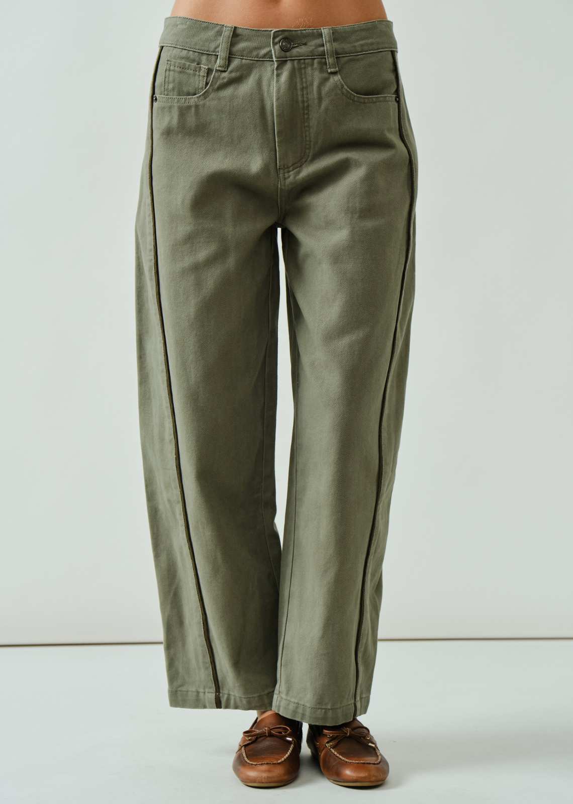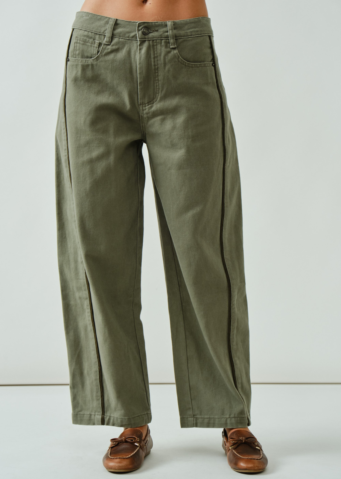 Upgrade your collection with these relaxed barrel pants, crafted from soft color denim for all-day comfort. Featuring contrast seam line detailing that elongates the silhouette, a high-rise fit, and roomy straight legs for effortless movement. Perfect for pairing with sweaters, tees, or outerwear for an easy yet stylish outfit.