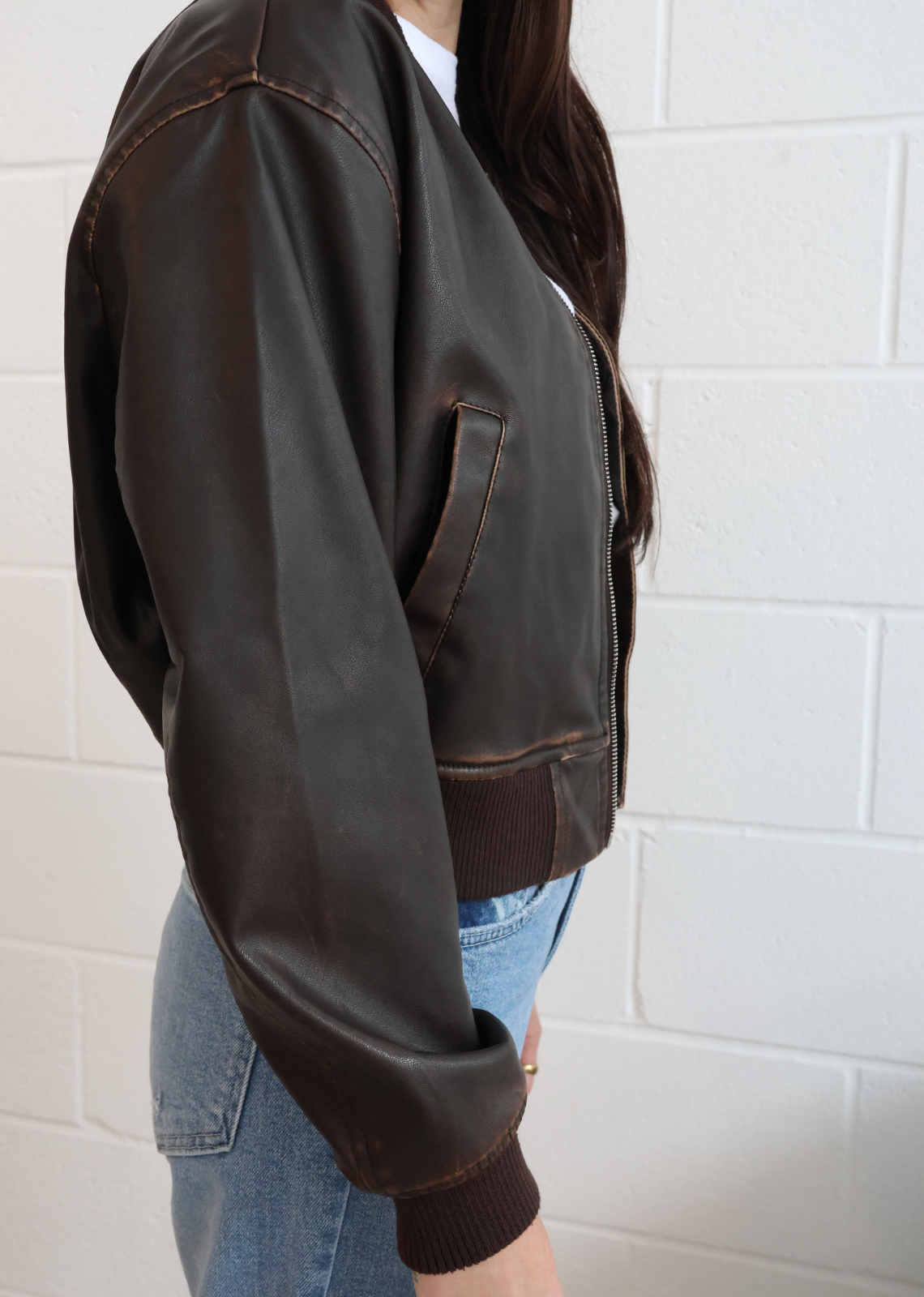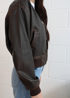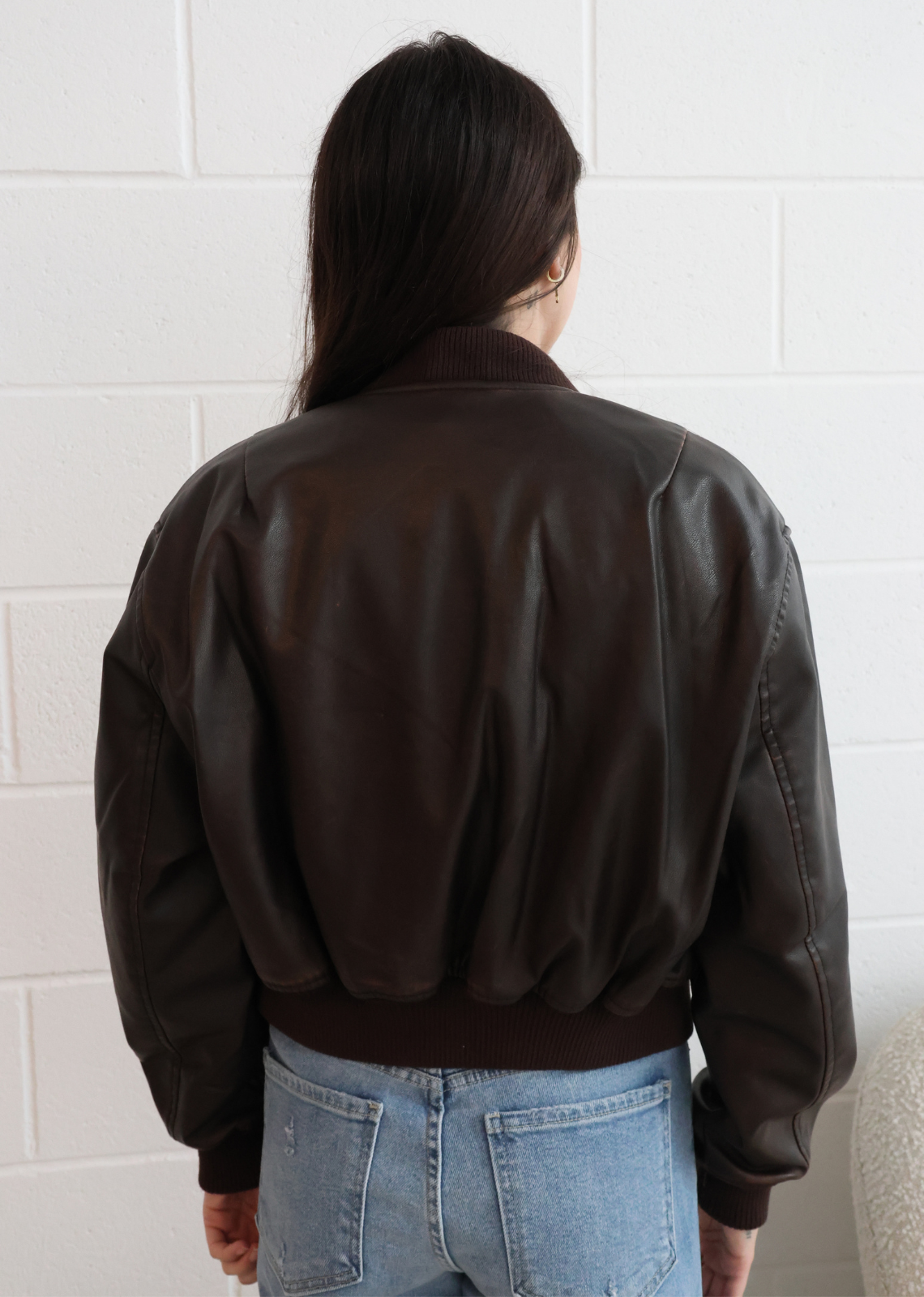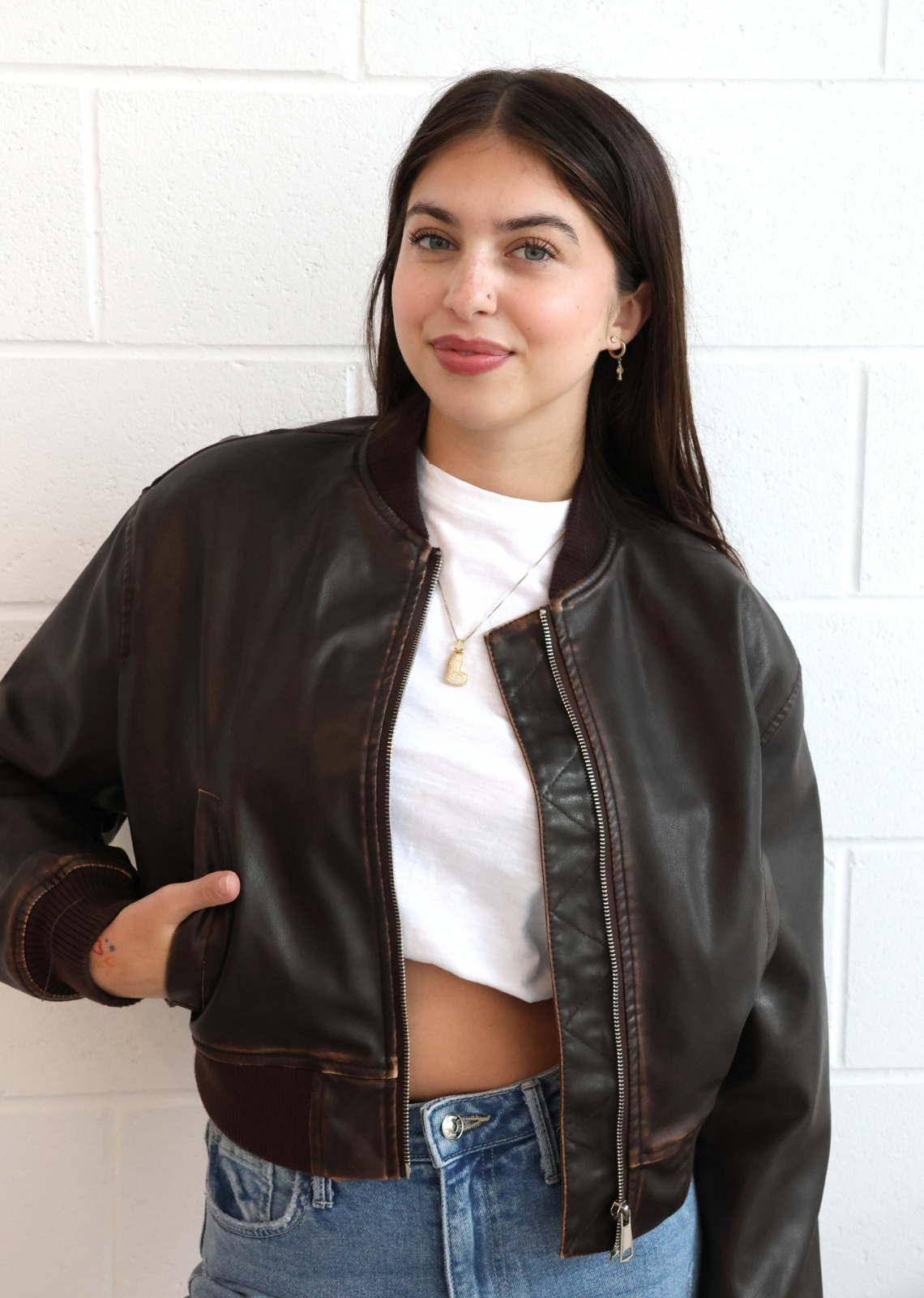 Who doesnt love a vegan leather jacket! This Deluc bomber will be the perfect piece to add to your fall collection due to its fashionable yet edgy look. Jacket has a beautiful dark chocolate brown colour, quilted inside lining, front zipper closure, cropped length, front pockets and a vintage distressed leather look.