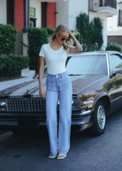 Introducing Bang On Blue's Super High Rise 90's Vintage Flare Jeans, crafted with comfort stretch denim for the perfect fit. The super high rise waist and 90's vintage style add a touch of sophistication, while the patched pocket and hem seam details elevate the look. Embrace timeless elegance in these full length flare jeans.