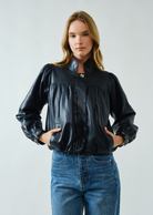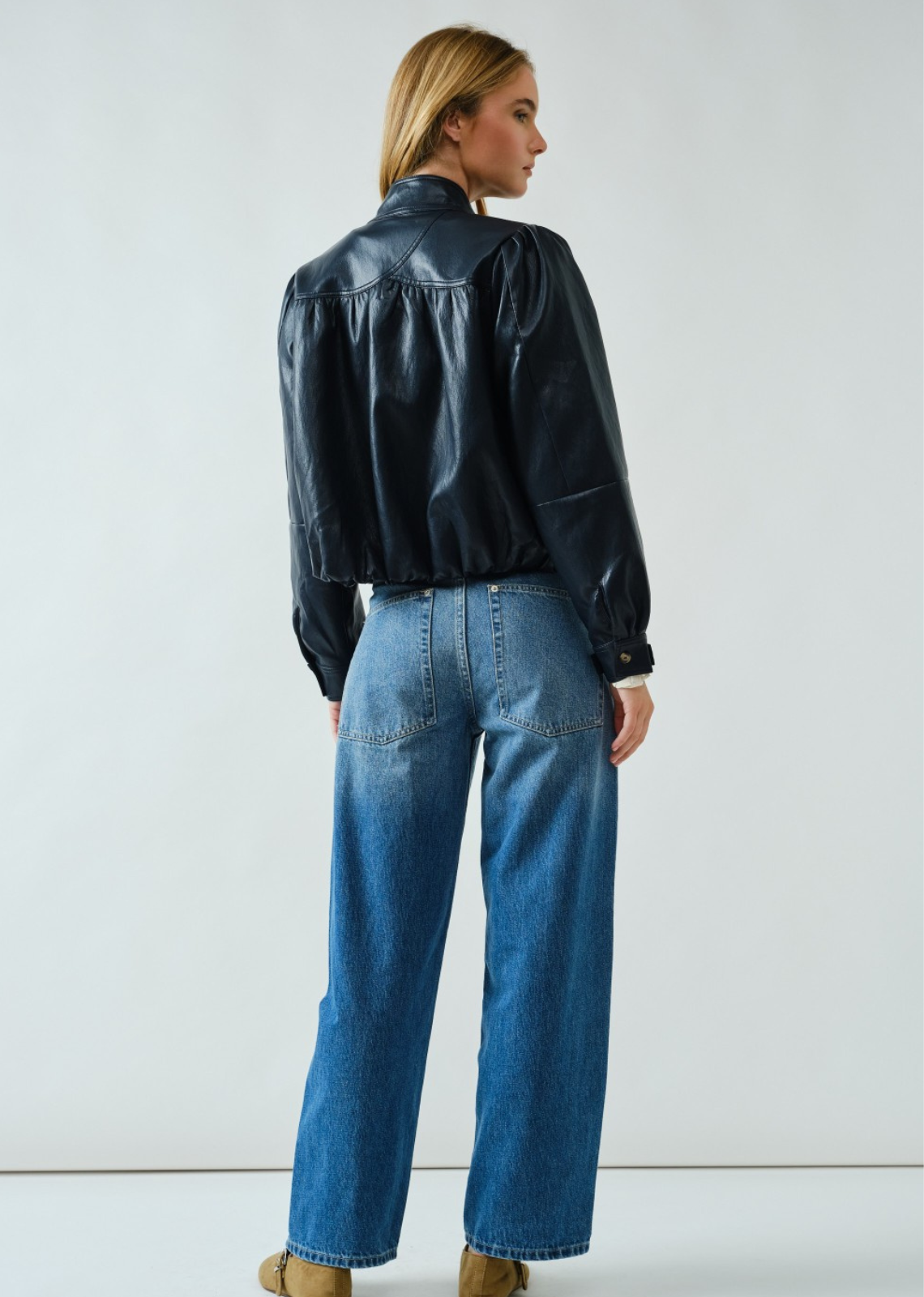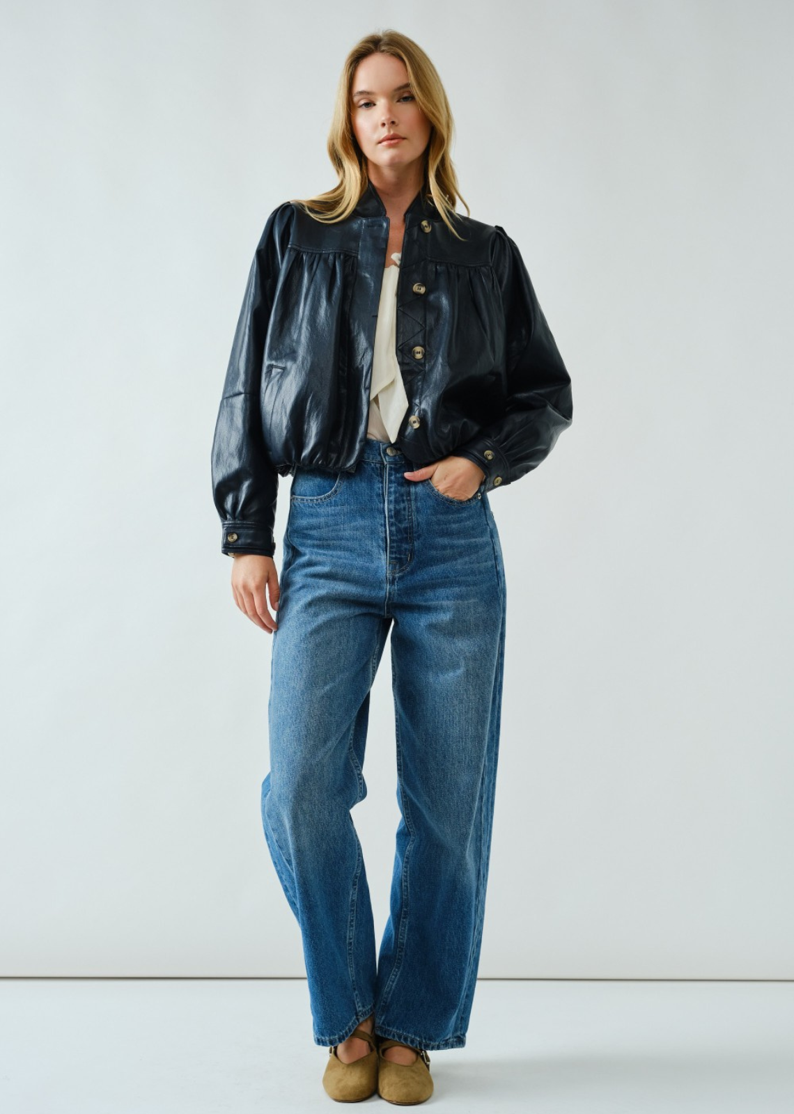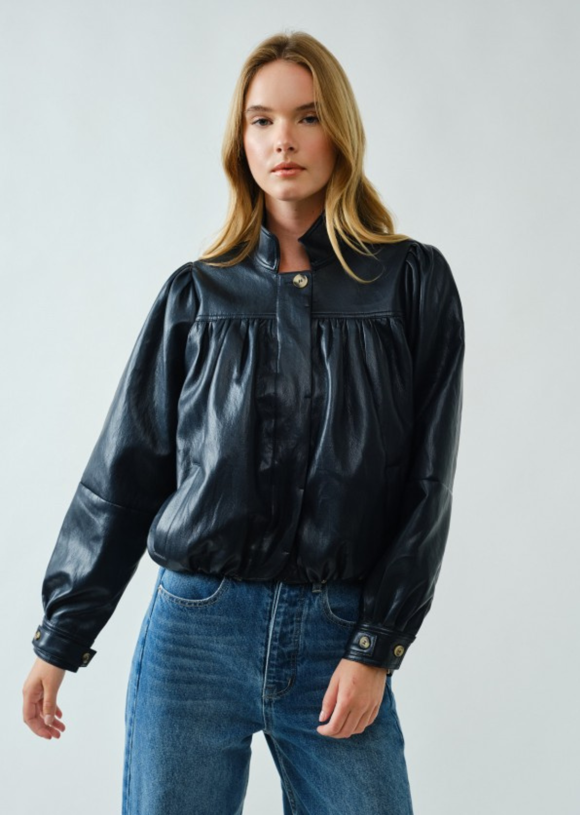 Effortlessly chic and endlessly versatile, this vegan leather jacket is a modern wardrobe staple. Designed with a relaxed fit and a gathered bobble hem, it brings a touch of structure while keeping things soft and comfortable. The buttery-smooth vegan leather feels luxurious to the touch, while details like the button-up front, puffed sleeves, and tailored cuffs add refinement.