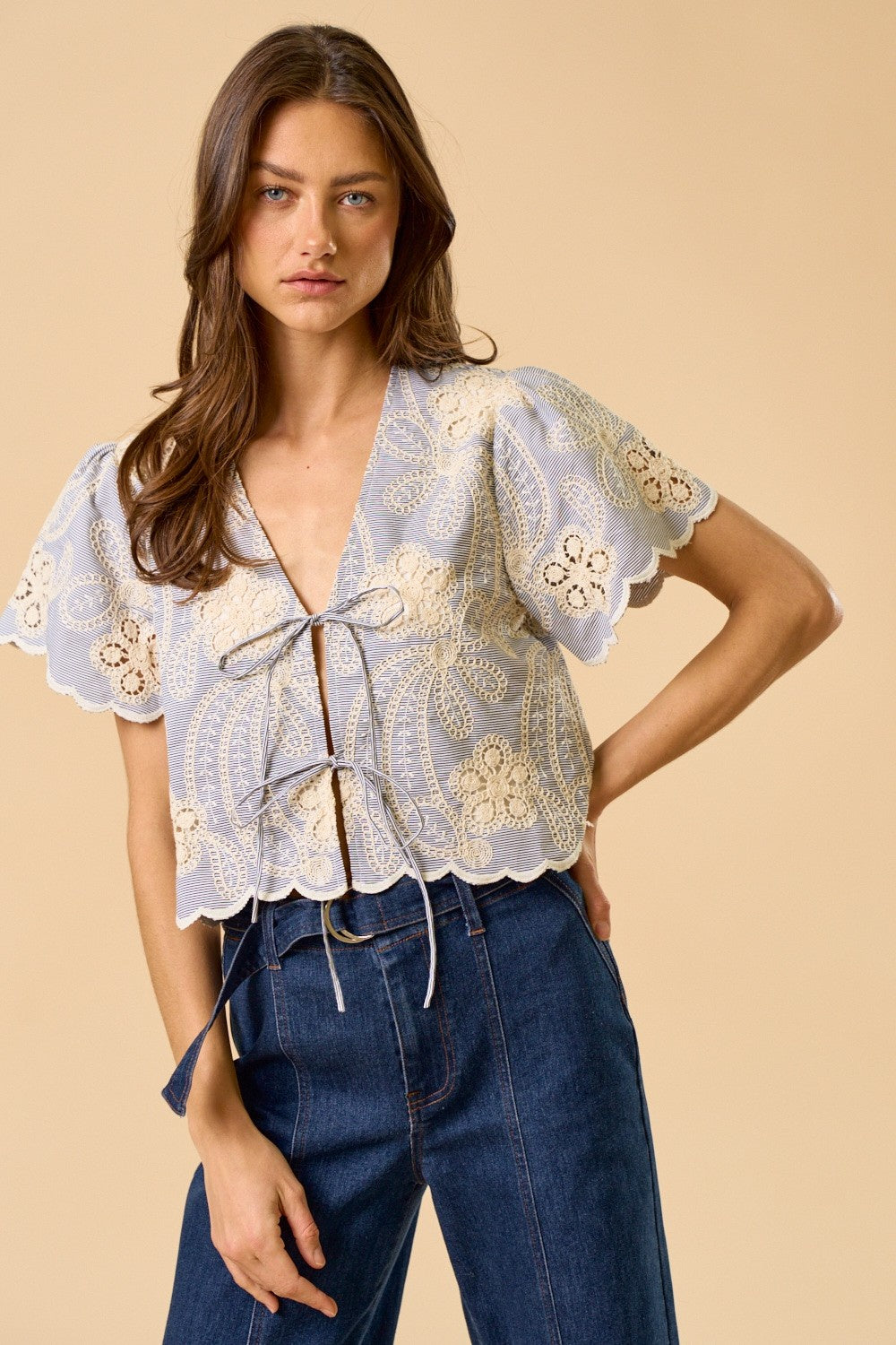 V-neck blue striped tie top with embroidery, crochet flowers, and scalloped hem along sleeves and bottom.