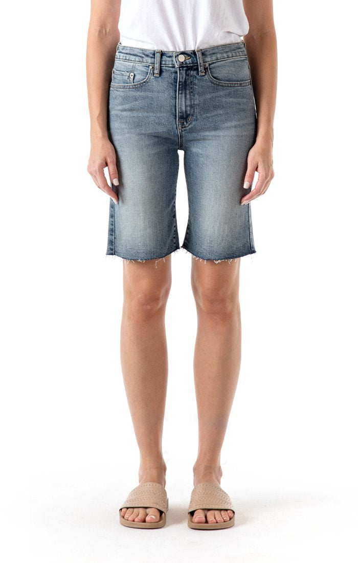 A medium blue vintage long short with some destruction and fraying at the hems. Cut from Crazy Horse Denim, for an authentic feel with comfort stretch added, guaranteed to have you feeling out of this world. A 90s classic made modern. Relaxed and comfortable with a longer than usual 10” inseam, the LA BREA SHORT hits right above the knees