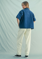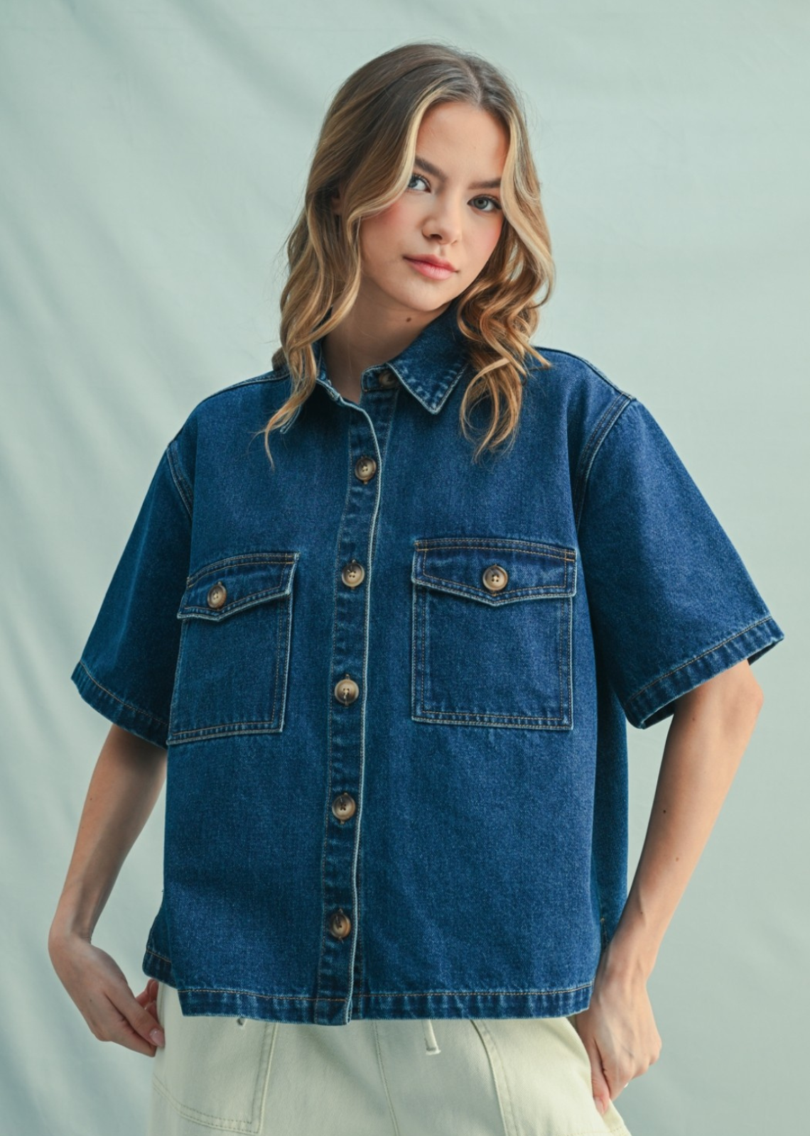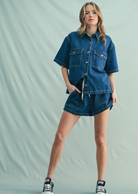 Dark wash oversized short-sleeve cotton denim button-up t-shirt featuring contrast stitching, and button flap breast pockets. Pair with matching shorts!