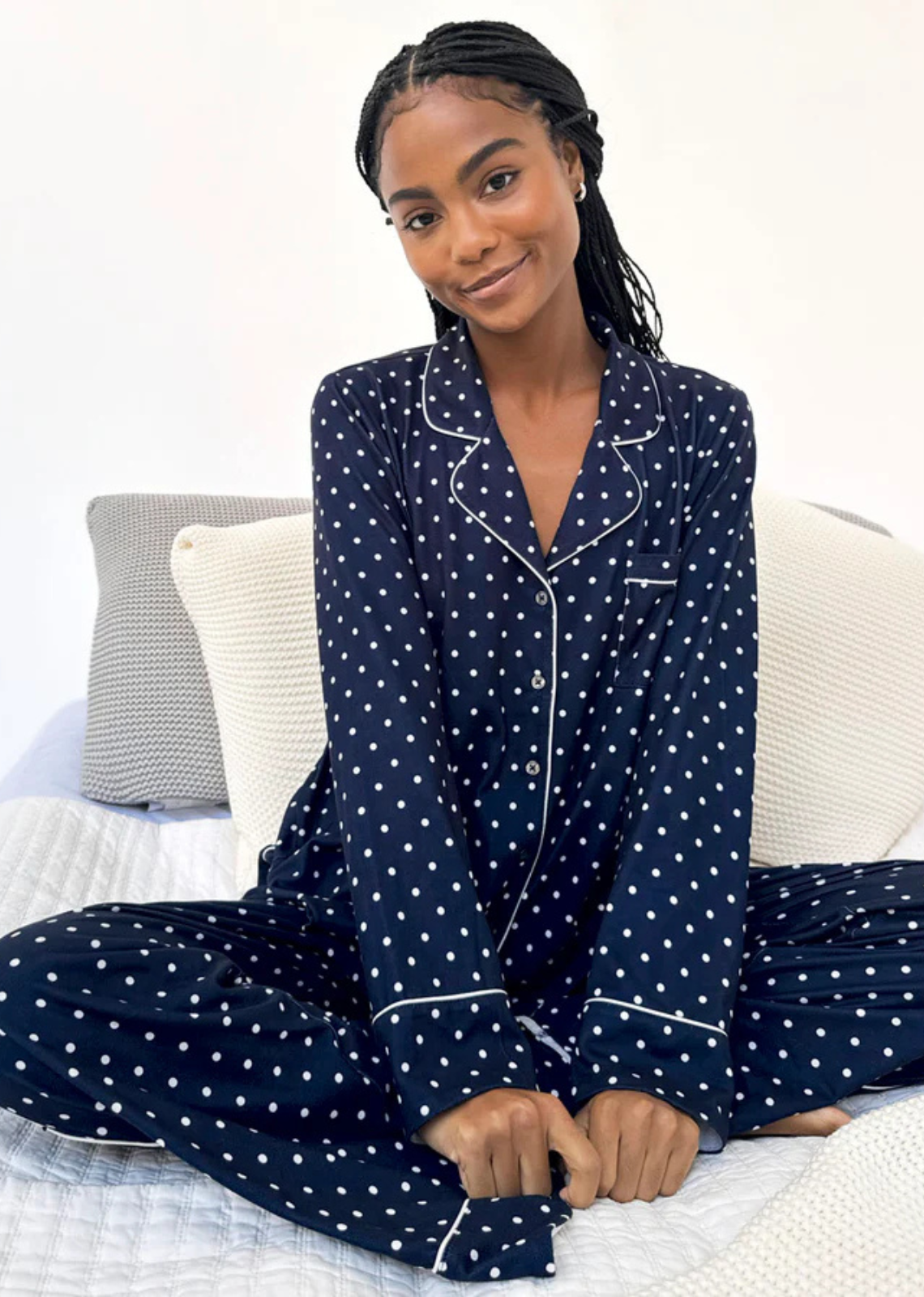From your evening skincare routine to a restful slumber, this sleep set has you covered. Made from our brushed-for-softness Pillowsoft fabric, it features a fun print on a notch collar button down and matching drawstring waist pants. This set has a slight sheen, minimal texture and an extra cozy feel.