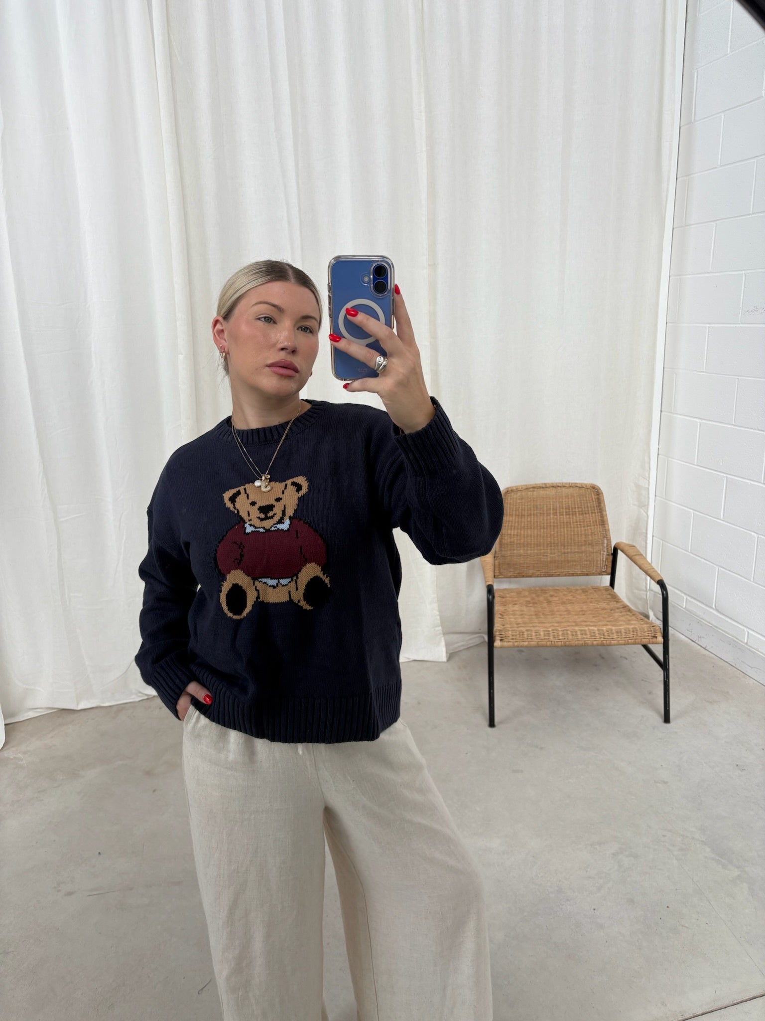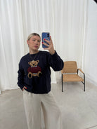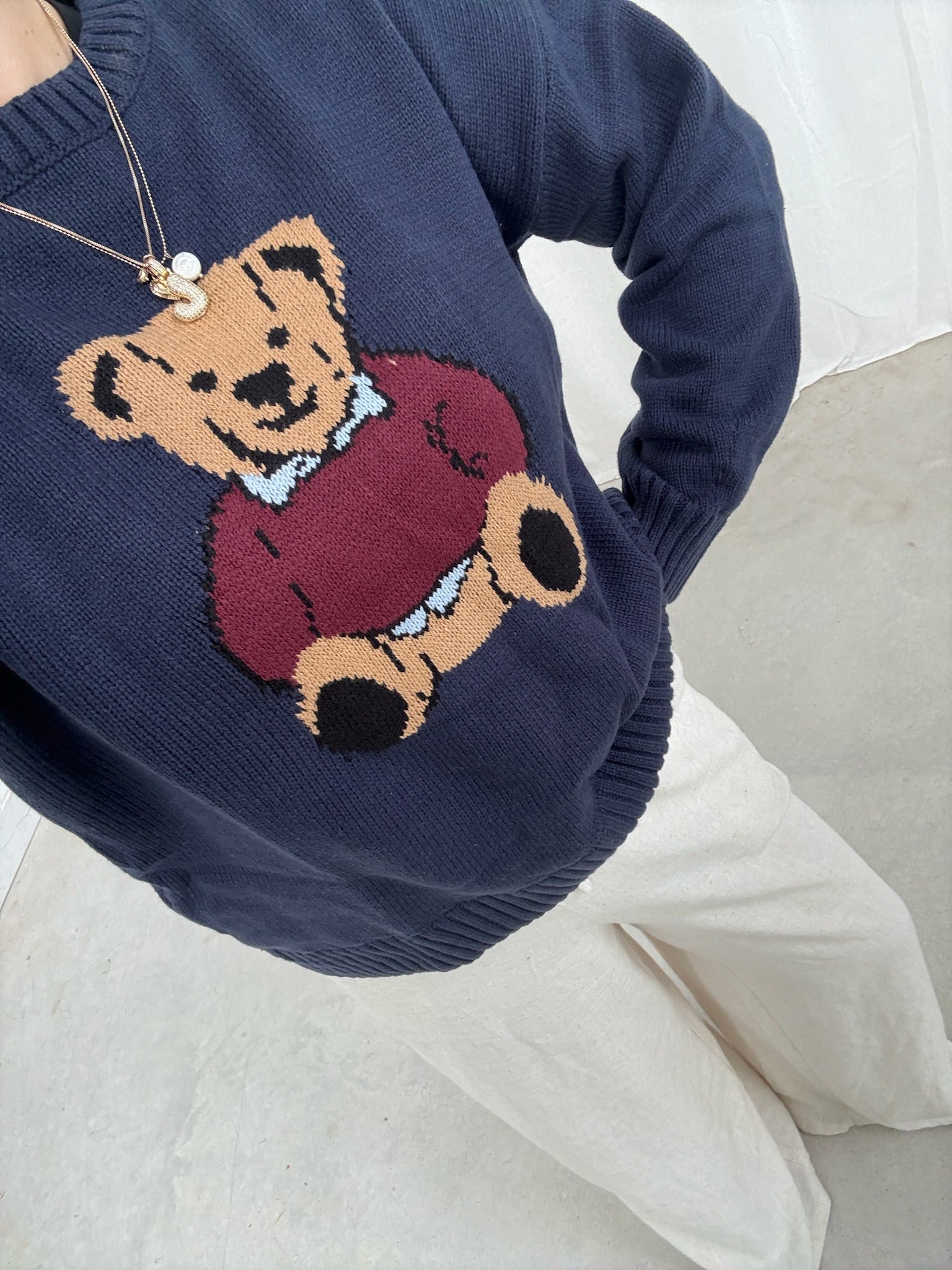 Navy sweater with graphic teddy bear wearing maroon sweater.
