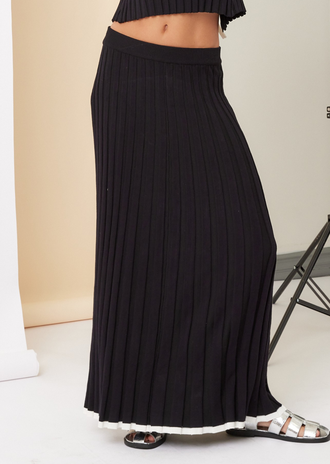 Contrast trim taupe knit a-line maxi skirt crafted from a soft ribbed knit, this skirt offers a snug, textured feel that enhances both comfort and style.